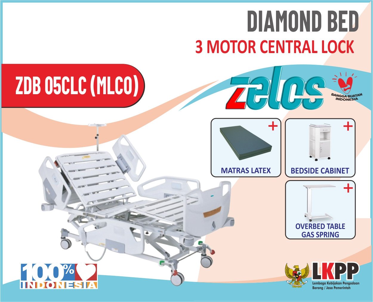 ZELOS DIAMOND BED 3 MOTOR CENTRAL LOCK+MATRAS LATEX+BEDSIDE CABINET+OVERBED TABLE