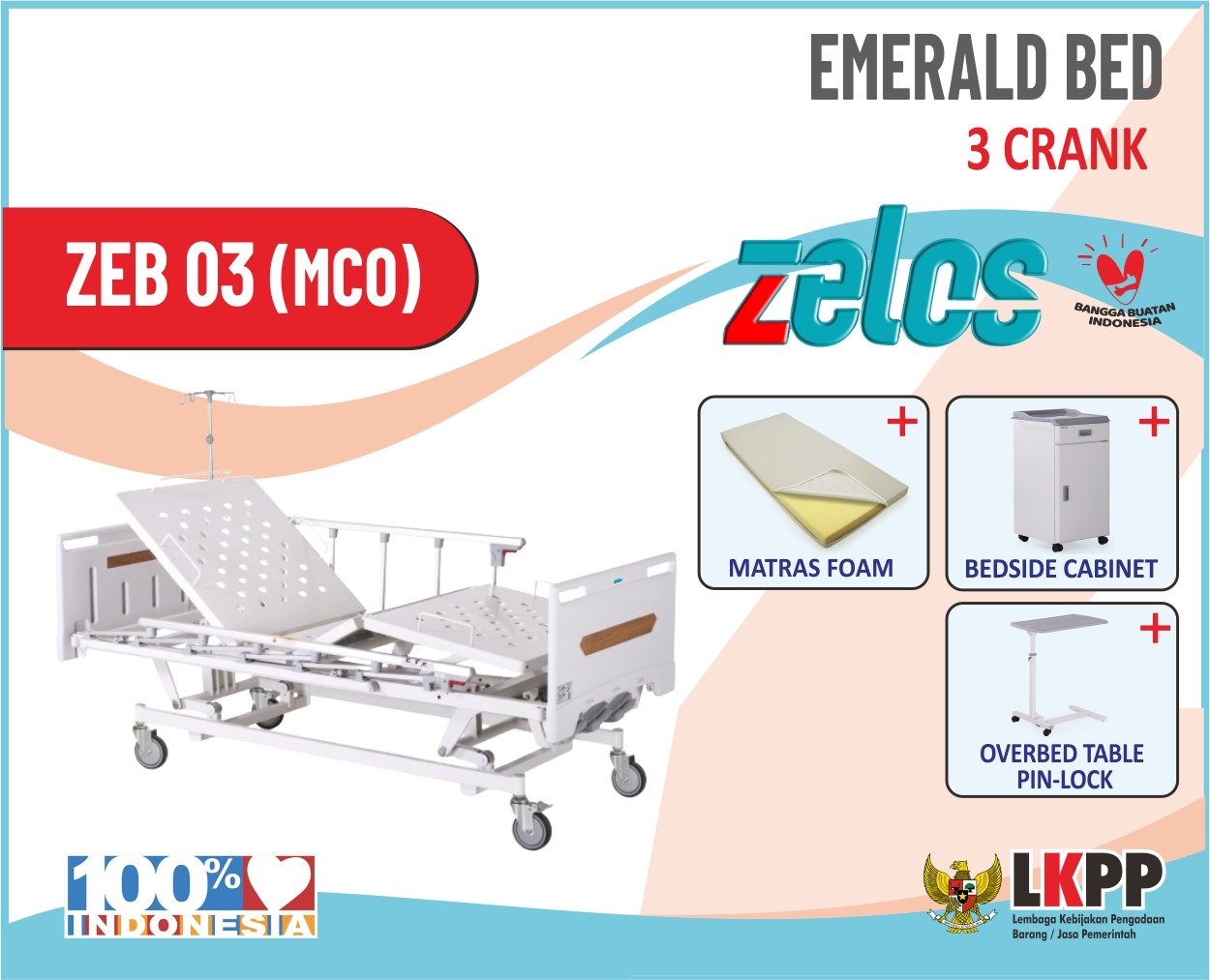 ZELOS EMERALD BED 3 CRANK + MATRAS FOAM +BEDSIDE CABINET + OVERBED TABLE