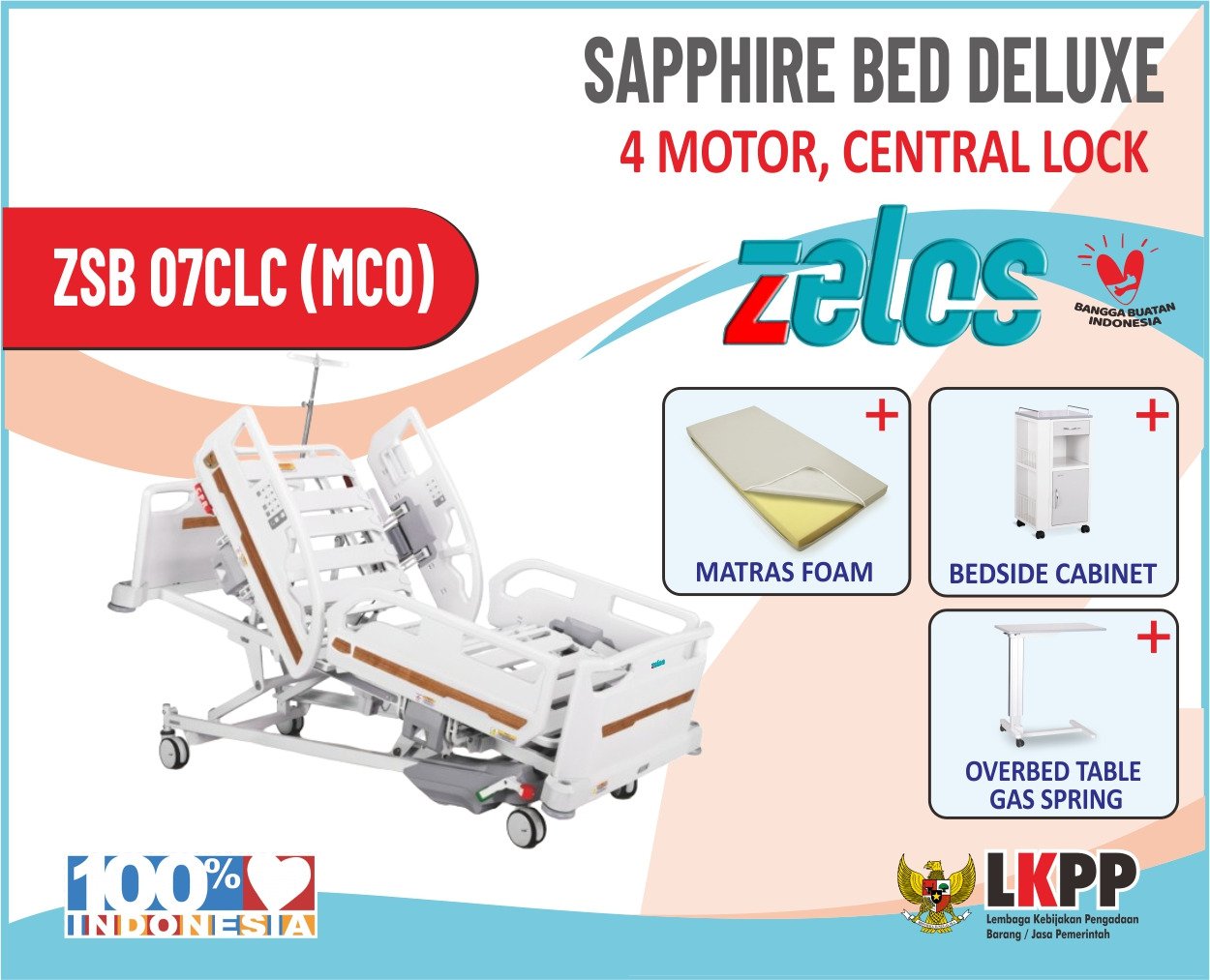 ZELOS SAPPHIRE BED DELUXE 4 MOTOR CENTRAL LOCK + MATRAS FOAM + BEDSIDE CABINET + OVERBED TABLE